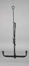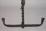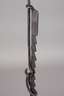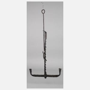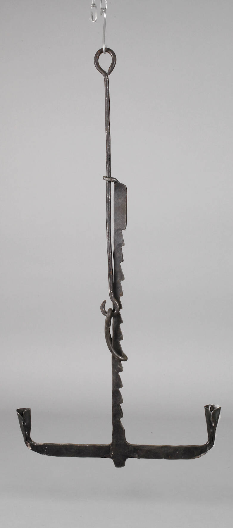 19. Jh., Schmiedeeisen geschwärzt, schlichter zweiflammiger Leuchter, an Zahnleiste höhenverstellbar, H max. 99 cm.