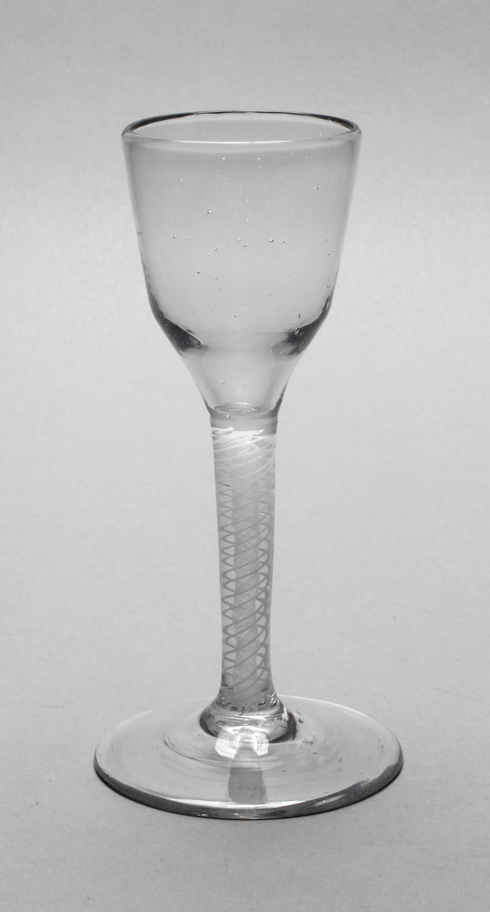 1. Hälfte 19. Jh., farbloses Glas, blasiger Abriss, flacher Scheibenfuß, konischer Stiel mit zweifach eingeschmolzener Spirale, glockenförmige Kuppa, Glas etwas blasig, insgesamt guter unbeschädigter Zustand, H 16,5 cm.