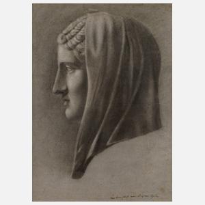 Bildnis von der Seite mit bedecktem Haar, Kohle mit partieller Weißhöhung auf getöntem Papier, um 1880, rechts unten unleserlich bezeichnet und signiert, minimale Knickspur, hinter Glas gerahmt, Falzmaße ca. 48 x 36 cm.