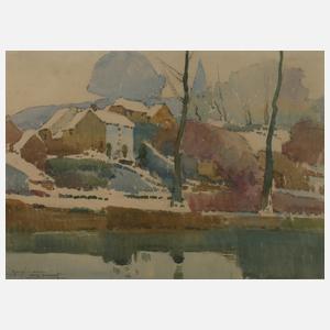 winterlicher Blick über ein Gewässer auf eine kleine Ortschaft, Aquarell über Bleistift, um 1930, links unten teils unleserlich bezeichnet und signiert „Giosey… alleno Ally Drooot“, leicht gebräunt, hinter Glas gerahmt, Blattmaße 32 x 44,7 cm.