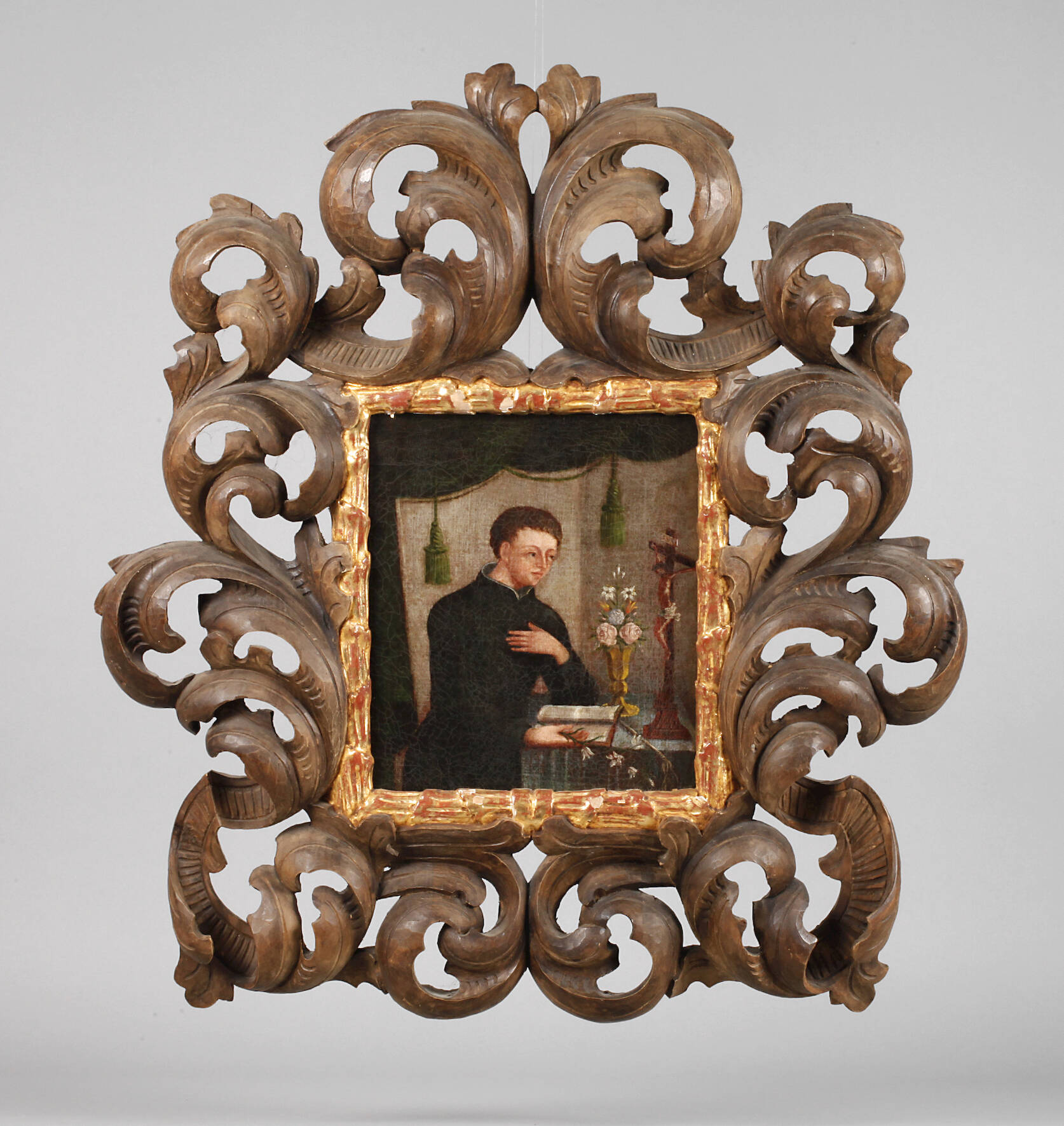 wohl Darstellung des betenden Heiligen Nikolaus von Tolentino (um 1245–1305) in schwarzem Ornat, mit seinen Attribut der Lilie in der Rechten und dem Buch am Altar, im 16.–18. Jahrhundert gehörte Nikolaus, als einer der Nothelfer für Freiheit und das tägliche Brot, zu den meist verehrten Heiligen, minimal pastose, barocke Genremalerei, Öl auf Leinwand, um 1700, unsigniert, Craquelure, wachsdoubliert, etwas restaurierungsbedürftig, im prächtigen neuzeitlichen, geschnitzten Florentiner Rahmen mit vergoldeter Innenkante (gering rest.bed.), Falzmaße ca. 27 x 23,5 cm.