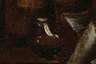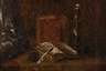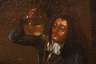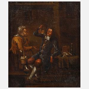 Szene einer Arztkonsultation, eine ältere, auf eine Krücke und einen Stock gestützte Frau in zerschlissenen Kleidern sucht einen herrschaftlich gekleideten Mediziner im spärlich erleuchteten Interieur auf, dieser hält einen gefüllten Glaskolben in seinen Händen und versucht, wie seinerzeit üblich, aus der Beschaffenheit dessen Inhalts auf die Krankheiten der Spender zu schließen, als Bezahlung trägt seine Patientin einen Korb Eier über dem Arm, lasierende, dunkeltonige Genremalerei, Öl auf Leinwand, wohl 17. Jh., links unten auf dem Flaschenzettel möglicherweise signiert "R. van W...", rückseitig zweifelhafte Zuschreibung an Mathys [oder Matthieu] van Helmont (1623 bis ca. 1679), Craquelure, alt doubliert und restauriert, in schöner Wellenleiste gerahmt, Falzmaße ca. 37 x 32 cm.