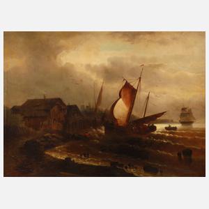 anlandende Fischer am steinigen Strand mit Bauernhäusern in der Morgendämmerung, lasierende, teils gering pastose Genremalerei im gedeckten Atelierton, Öl auf Leinwand, wohl 18. Jh., unten mittig undeutlich signiert "Wuger" oder "Wüger", Craquelure, Keilrahmen etwas durchzeichnend, hinterlegte Fehlstellen in der Leinwand, restauriert, etwas restaurierungsbedürftig, gerahmt, Falzmaße ca. 74 x 99,5 cm.