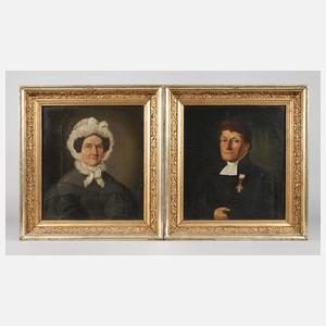 Portrait einer Frau mittleren Alters, mit Haube und Hammelkeulenärmeln und er im Talar mit Beffchen und dem dänischen Dannebrogorden an der Brust, teils mit spitzem Pinsel ausgeführte Portraitmalerei, Öl auf Leinwand, um 1830, Craquelure, hinterlegte Löchlein, gerahmt im Rahmen der Mitte des 19. Jh., Falzmaße ca. 34,5 x 30 cm.