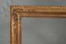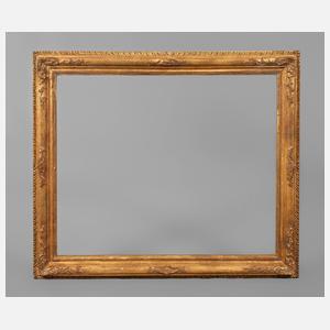 Rahmen aus ca. 6 cm breiter, zur Leistenmitte steigend profilierter, mit schmalen Ornamentbändern sowie schlichten Eck- und Mittelkartuschen gestuckter und vergoldeter Holzleiste, Gehrungen über Eck gearbeitet, patinierte Vergoldung wohl erneuert, Falzmaße ca. 47,5 x 57,5 cm.