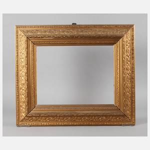 um 1890, Rahmen aus ca. 14 cm breiter, zur Rahmenmitte ansteigend profilierter Holzleiste mit Lorbeerstab und flachem plastischen Gründerzeitdekor, Vergoldung mit Goldbronze übergangen, Gehrungen geschnitten, Erhaltungsmängel, Falzmaße ca. 42 x 54 cm.