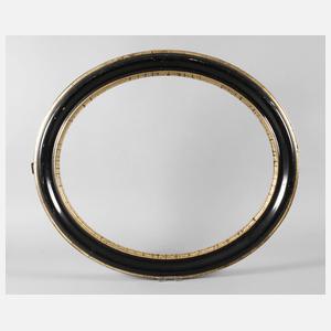 hochovaler Rahmen aus ca. 8,5 cm breiter, zur Rahmenmitte ansteigend profilierter, schwarz gelackter Holzleiste mit versilberter und schelllackpatinierter Innen- und Außenkante, Altersspuren, Falzmaße ca. 73,5 x 62,5 cm.