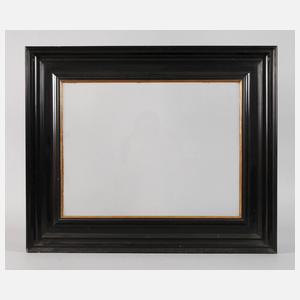 um 1910, tief profilierte Leiste, geschwärzt, mit goldener Kontrastleiste, diese blattvergoldet, rückseitig verblattete Gehrungen, beigegeben eine Glasplatte, allgemein guter Zustand mit geringen Restaurierungsstellen und etwas restaurierungsbedürftig, Innenmaße 60 x 45 cm
