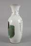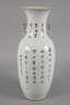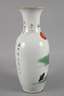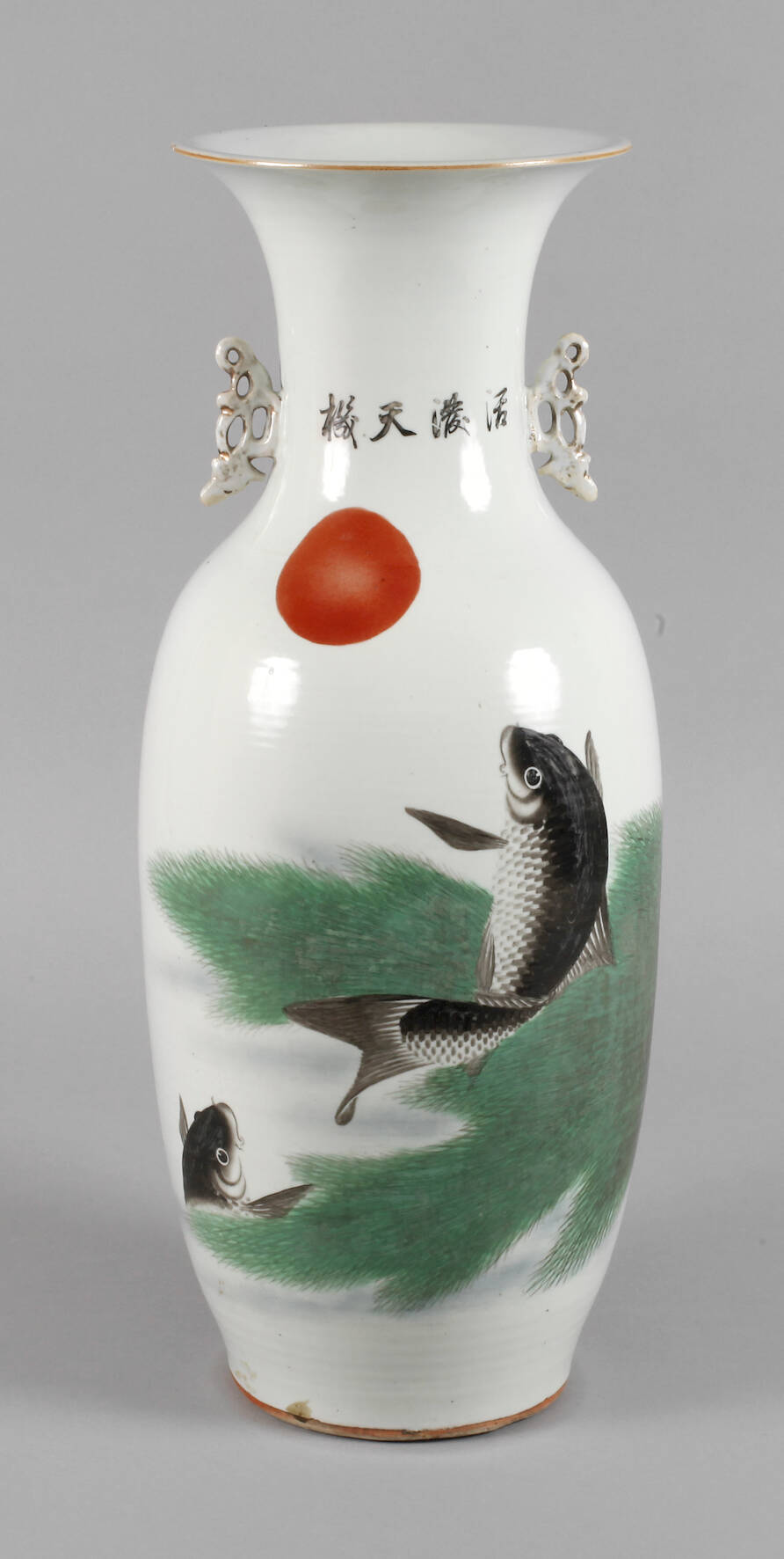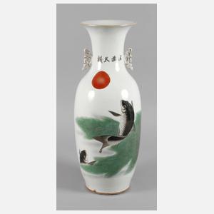 1920er Jahre, am Boden Vier-Zeichen-Marke, Porzellan in polychromer Aufglasurbemalung, partiell goldstaffiert, schlanker Korpus mit zylindrischem Hals und ausschwingender Mündung, zwei seitliche Handhaben in Form abstrahierter Drachen, Front mit Karpfenmotiv, rückseitig Kalligrafie, Vergoldung berieben, etwas brandfleckig, Mündung winz. best., H 59 cm.