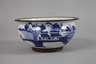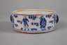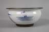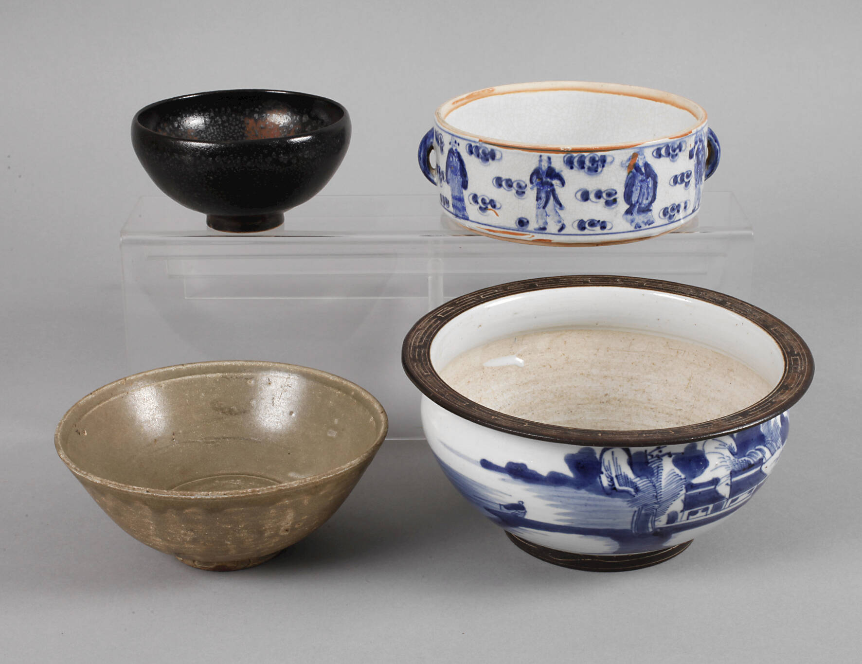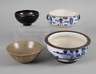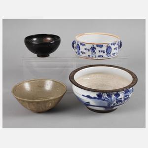 19./20. Jh., dabei Schale Yaozhou-Ware im Stil der nördlichen Song-Jin-Dynastie, cremefarbener Scherben mit schwarzer eisenhaltiger Glasur mit grau-braunen Einsprenkelungen, dazu Schale Longquan-Ware im Song-Stil, cremefarbener Scherben seladongrün glasiert, im Spiegel mit geprägter Vier-Zeichen-Marke, des Weiteren zylindrische Stapelschale mit zwei seitlichen Handhaben in kobaltblauer Unterglasurbemalung und gepinselter Sechs-Zeichen-Shunzhi-Marke sowie gebauchte Schale mit ausschwingender Mündung, teils mattbraun, teils kobaltblau glasiert, mehrfach undeutlich gestempelt, unterschiedliche Maße und Erhaltung, D max. 20 cm.