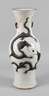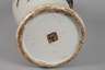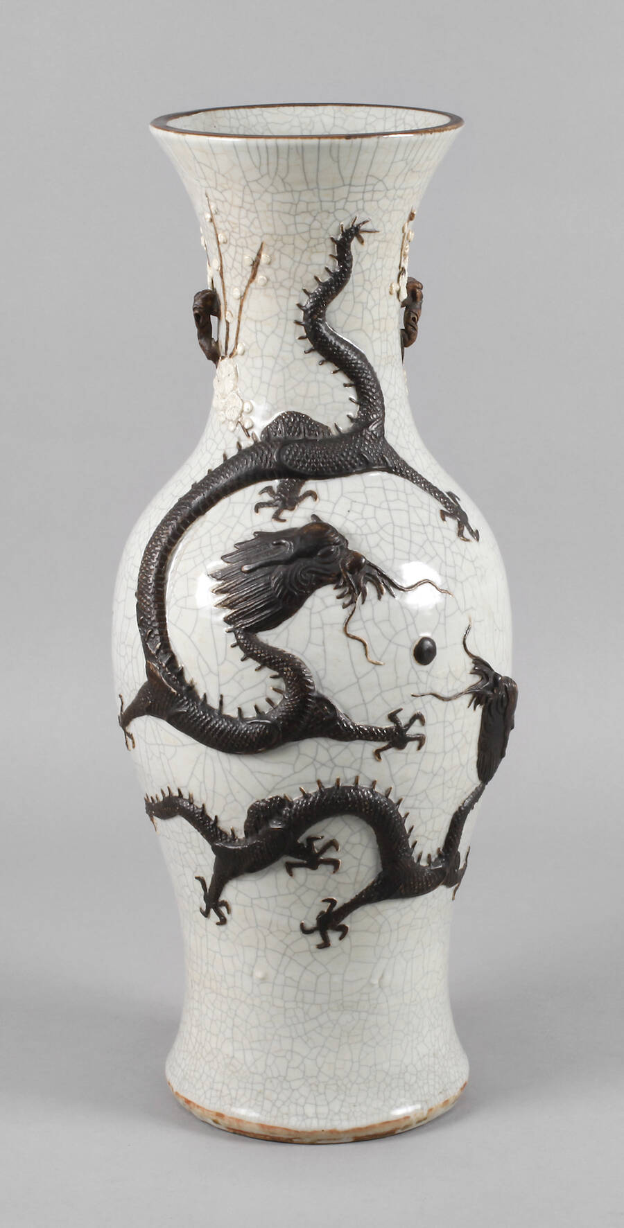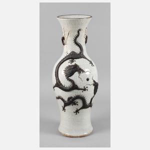 um 1920, am Boden Vier-Zeichen-Prägemarke, Porzellan mit cremefarbener Craqueléglasur sowie prachtvollem reliefierten und braun staffiertem Drachenmotiv, hoher Balusterkorpus mit zylindrischem Hals und ausschwingender Mündung sowie angedeuteten Handhaben als blühende Kirschzweigen, Hals restauriert, winz. best., H 61 cm.