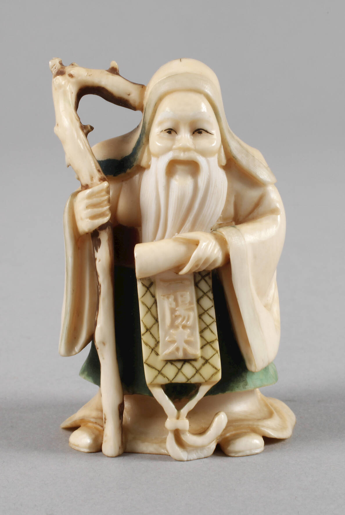 20. Jh., signiert, Elfenbein beschnitzt, teils fein graviert und farbig gefasst, vollplastische Darstellung einer der sieben Glücksgötter, Fukurokuju ist der Gott der Weisheit, des Glücks und des langen Lebens, winz. best., etwas berieben, H 8 cm.